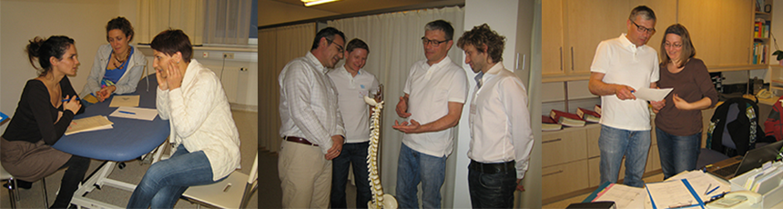 Die angehenden OsteopathInnen, die bereits eine Vorausbildung als Arzt/Ärztin oder PhysiotherapeutIn haben, behandeln eine/n ihnen möglichst fremde/n PatientIn, komplett von der Anamnese, über Diagnose, Therapie bis zu weiteren Empfehlungen.